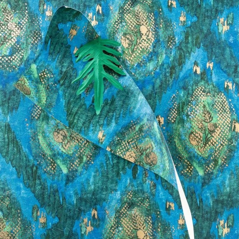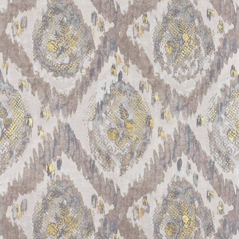 Isabelle aime l’or, qui illumine comme une présence, comme quelque chose de sacré, rendant tout plus beau et vivant. Une matière à part qui traverse les siècles, qui capte la lumière et révèle les couleurs. L’or évoque aussi la main de l’artisan, qui a toujours fasciné Isabelle. Les ikats irréguliers sont précieux pour elle, car ils évoquent la liberté de son geste. La vibration du motif devient vivante et donne l’impression qu’il respire. Les ikats représentent également le goût du voyage d’Isabelle et la route de la Soie. Le studio Pierre Frey a redoublé de créativité et de technicité pour reproduire fidèlement et de manière inédite l’œuvre de l’artiste. L’intissé froissé, l’impression digitale et la surimpression dorée réalisée de manière traditionnelle font de ce motif un revêtement mural d’exception.