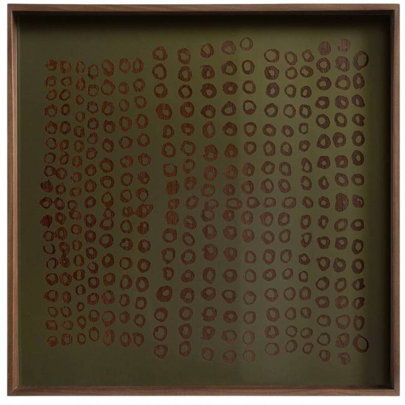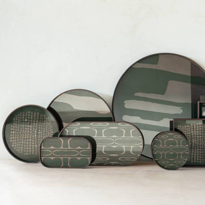 La collection de plateaux Second Nature s'inspire des formes organiques et des ombres abstraites de la nature : les empilements de pierres, l'écorce d'un arbre, les marques sur la carapace d'une tortue. Mélange harmonieux d'inspiration organique et de design contemporain, Second Nature combine parfaitement le verre imprimé à la main et la chaleur du bois. La richesse artistique du vert mousse et de la palette d'encre métallique confère une sophistication feutrée à son environnement.