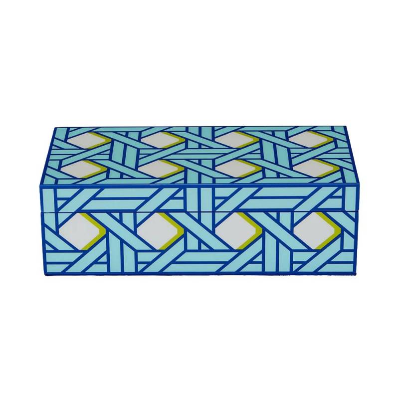 Présentant un motif de panier tressé traditionnel dans des tons bleus froids avec une touche de vert citron. Doublé de velours et poli à la main pour une brillance parfaite. Un ajout chic, preppy et ordonné à votre étagère, manteau de cheminée ou décor de table. Gardez vos biens à portée de main mais cachés. Disponible en trois tailles pour ranger, empiler ou faire une déclaration autonome.
