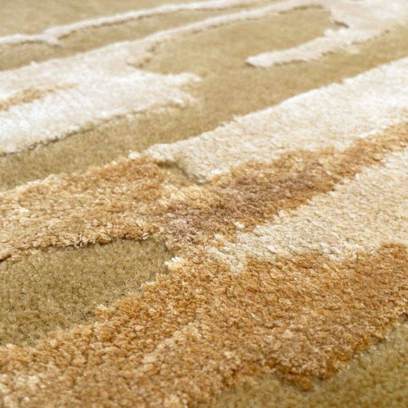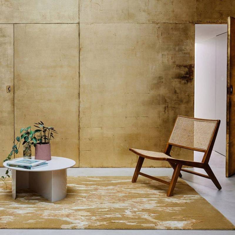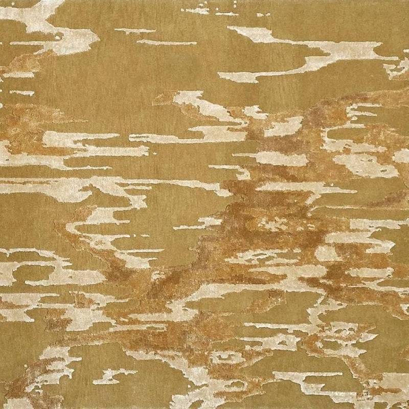 Le motif en nuances bleues telle une coulure filant le long de la toile rappelle l’origine liquide du pigment en peinture. Abstrait et expressionniste, le motif recouvre toute la surface du tapis à la manière d’un all-over.