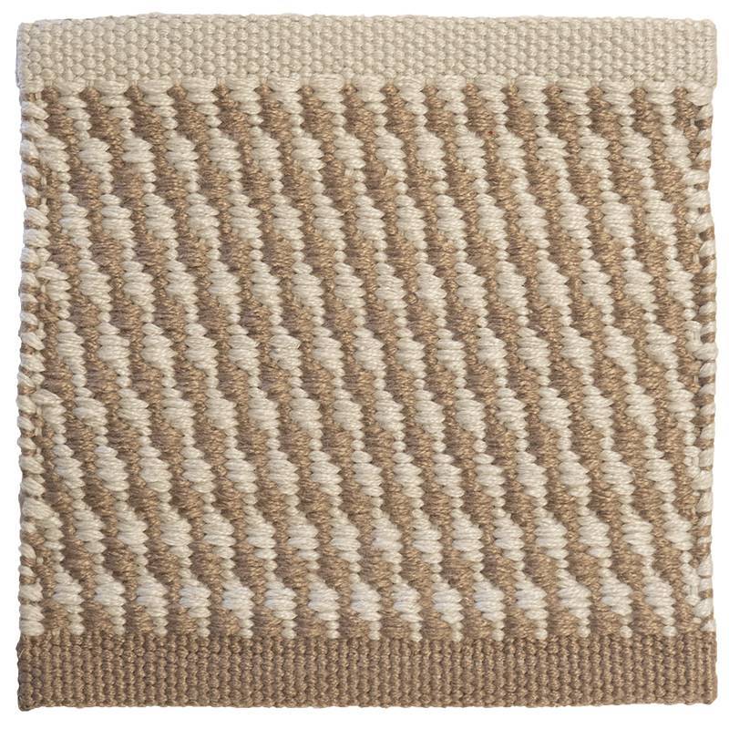 La collection Tramuntana se caractérise par ses boucles diagonales qui forment un motif sur l’ensemble du tapis. Ce tapis est tissé à la main avec du polyéthylène téréphtalate (PET), une fibre textile issue de contenants plastiques recyclés. Tramuntana est conçu pour les espaces intérieurs et permet de transposer l’esthétique des tapis d’été à des terrasses et espaces extérieurs couverts. La finition repliée du tapis est personnalisable et peut être choisie parmi trois options : en blanc, dans la couleur du tapis ou une combinaison des deux.