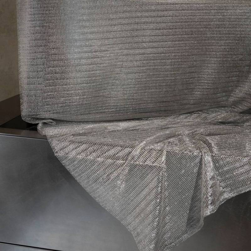 Un bijou textile ciselé avec la précision d’un orfèvre : un fil métallique très fin diffuse une lumière délicate et magnétique sur un voile à la main étincelante, surprenant par son caractère fluide et presque aérien. L’armure ouverte, réalisée sur des métiers crochet, crée une transparence marquée. Des motifs en zigzag superposés génèrent un mouvement vibrant sur une surface aux tons lumineux. Sa laize de 160 cm permet la confection d’amples rideaux.