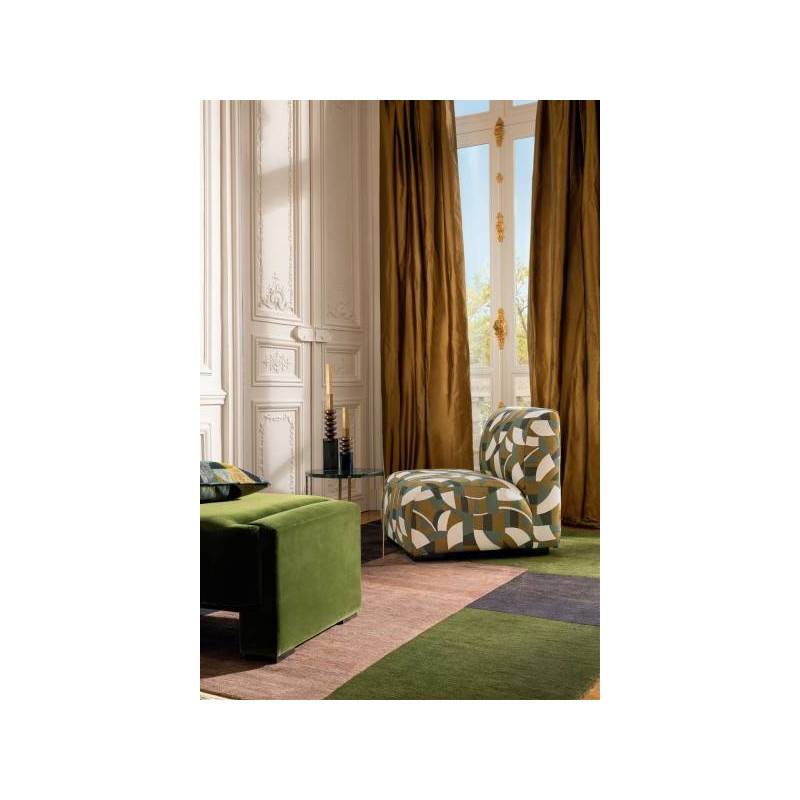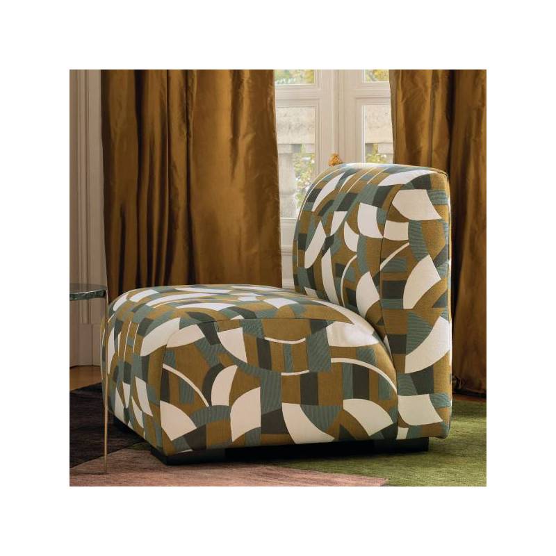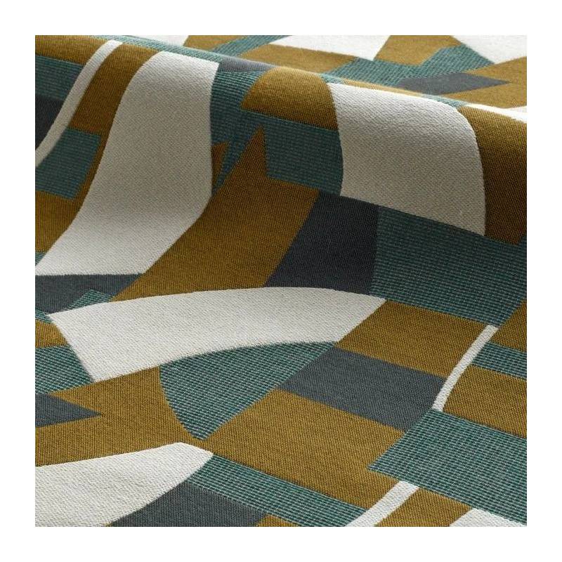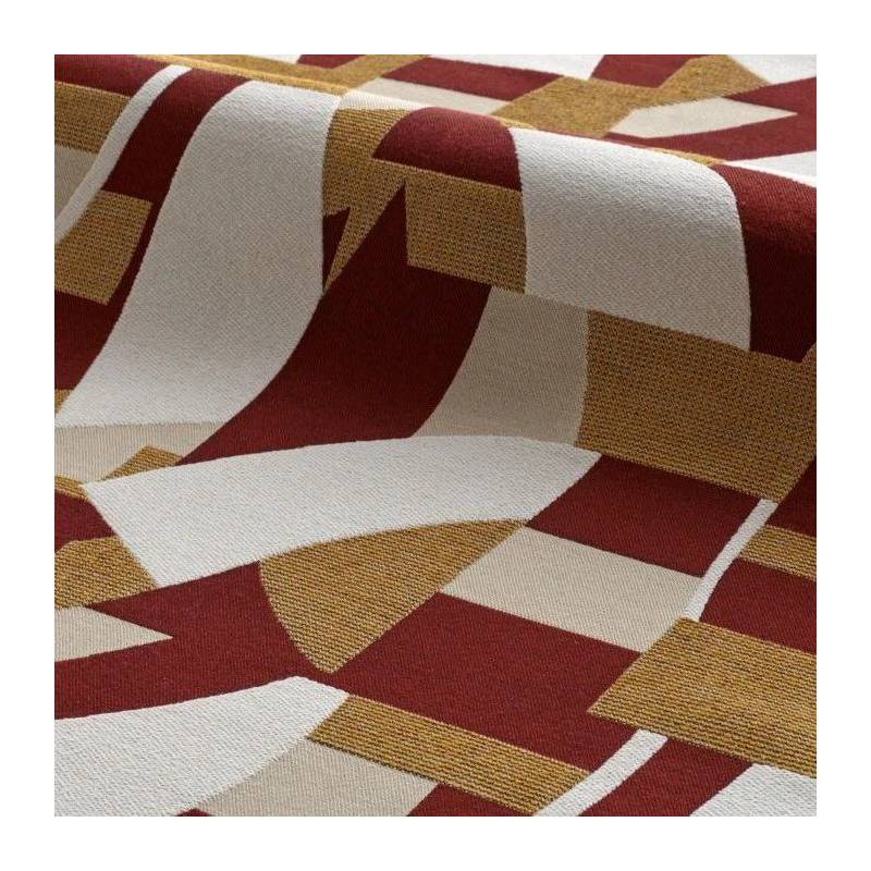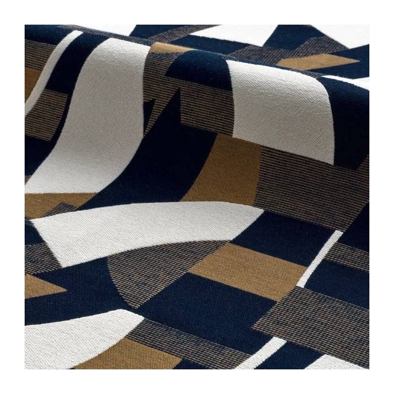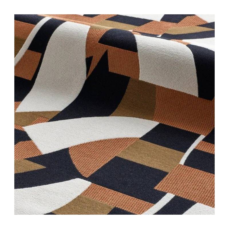 Ce jacquard originaire d’Italie s’inspire des toiles d’Otto Freundlich, peintre allemand maître de la couleur, et précurseur de l’art abstrait. Sur une base avec une récurrence de mordoré, d’ivoire et de carbone, des aplats de couleurs tantôt bleu Céladon, Terracotta, Bleu Misia ou Arabesque étirent leurs formes abstraites. Le choix d’une trame fine à certains endroits, épaisse à d’autres, et de tissages tantôt serrés, en lignes ou en points, concourent à ce très raffiné jeu visuel et texturé. La rythmique des formes et des couleurs chante une ode à l’harmonie, qui sera du plus bel effet dans des réalisations pour le siège à usage classique et d’autres objets de décoration tels que des coussins.
