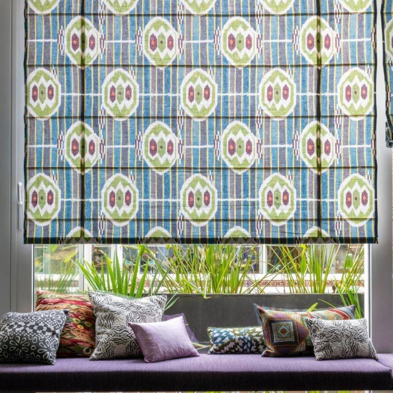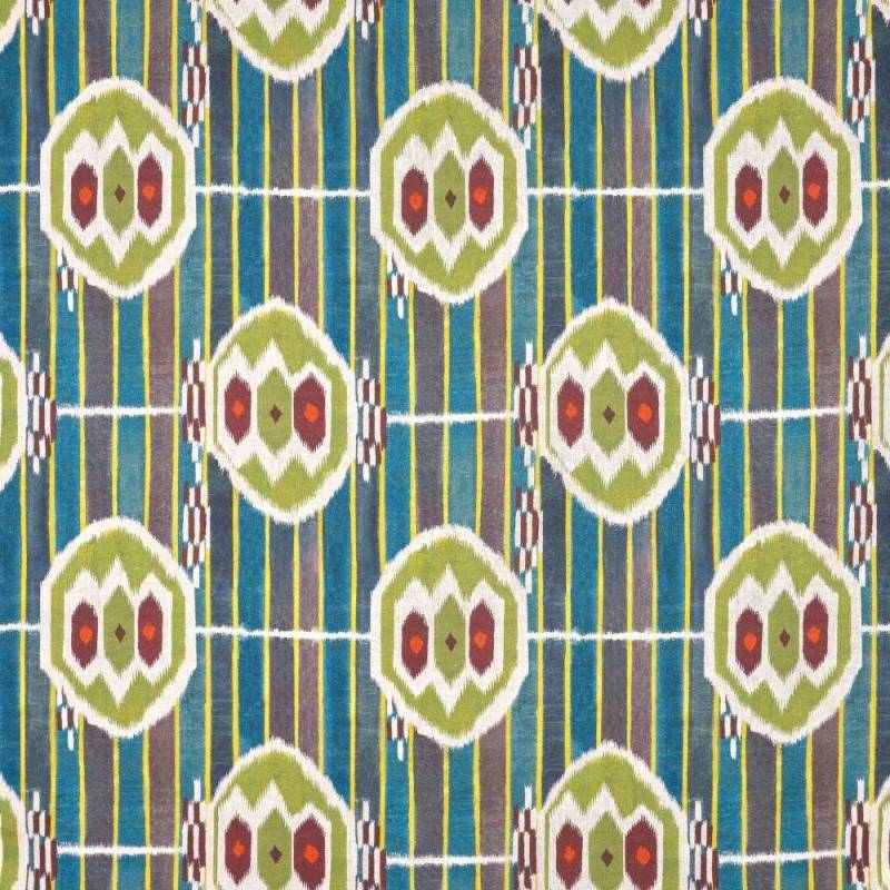 Ce motif est issu d’un kaftan de papier. Isabelle de Borchgrave a transformé la tradition textile d’Asie centrale en sculpture vivante. Le motif ovale répété encadré de lignes verticales évoque ces tissages ancestraux où la couleur vibre et danse. L'artiste a créé une collection de dix kaftans qui a fait l’objet d’une belle exposition. Ce dessin est si beau et si pur que son adaptation textile fut évidente, magnifique imprimé sur lin souple.