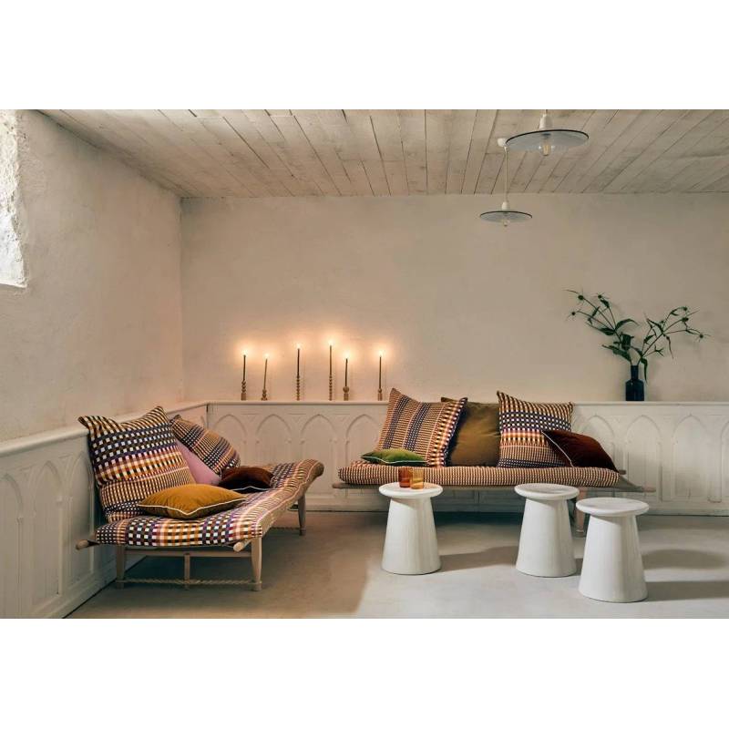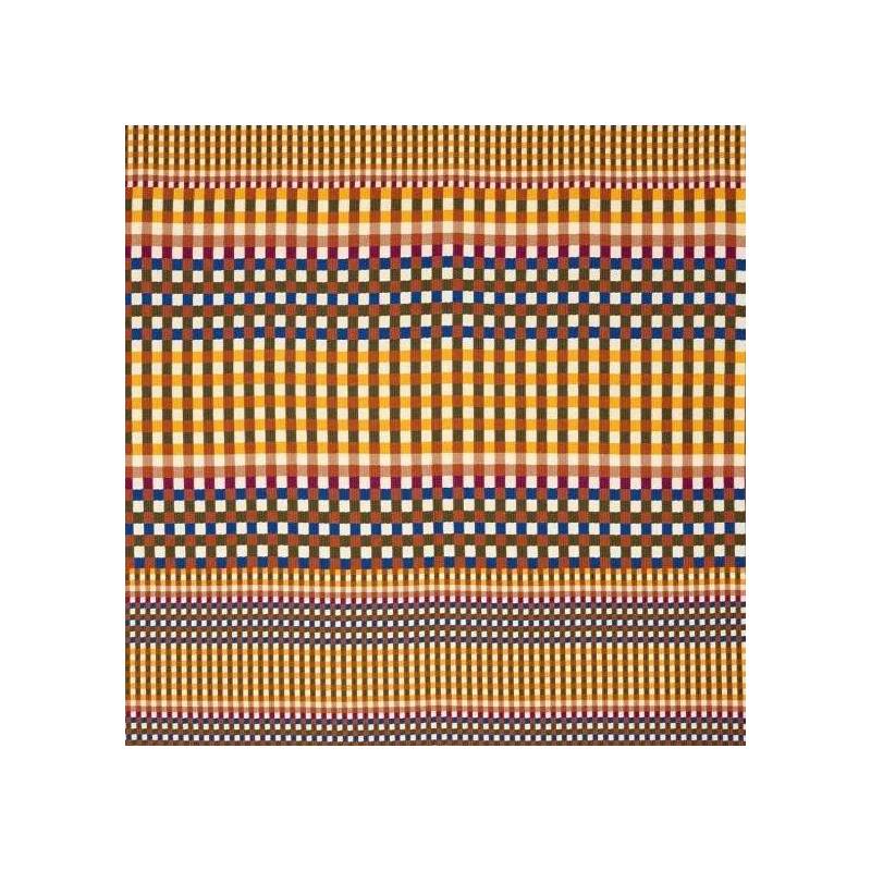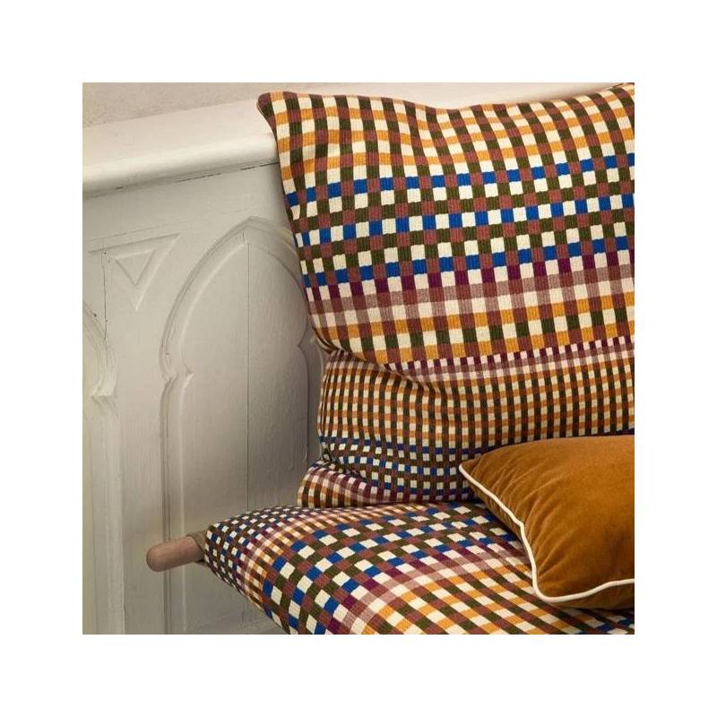 Jacquard de coton aux teintes intenses, DIN revisite un motif dégradé de carreau dans un esprit moderniste assumé.