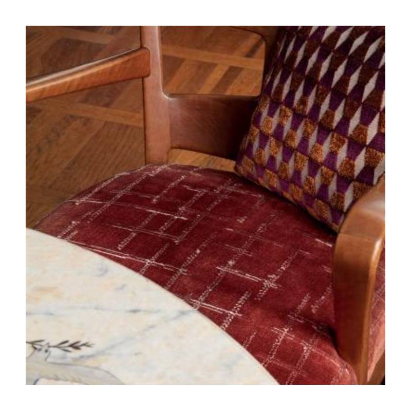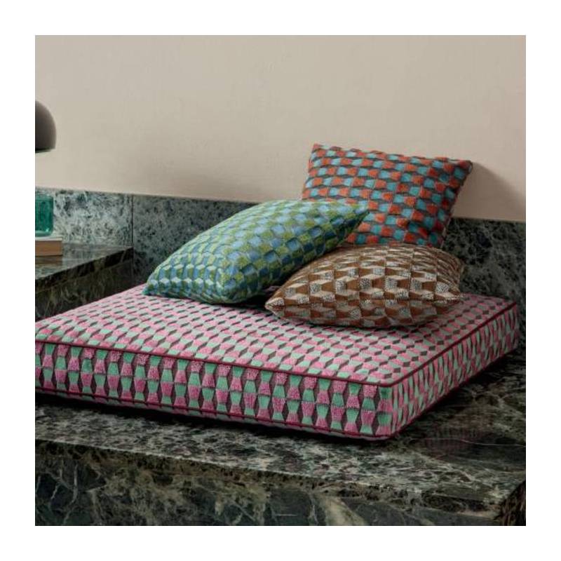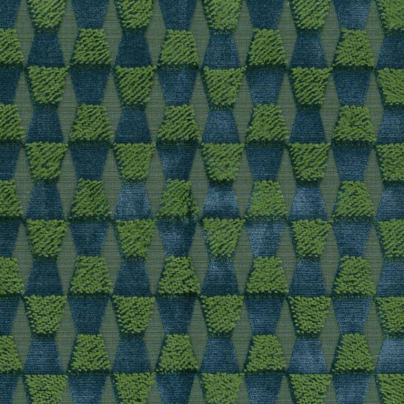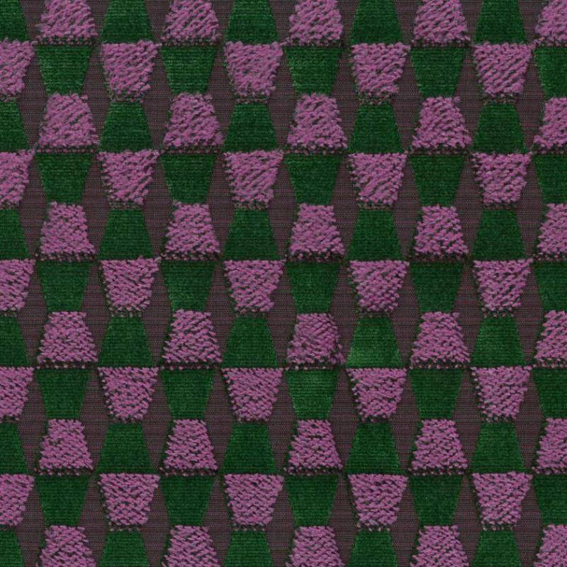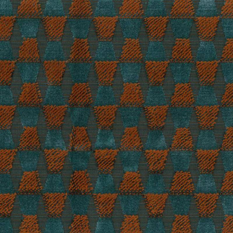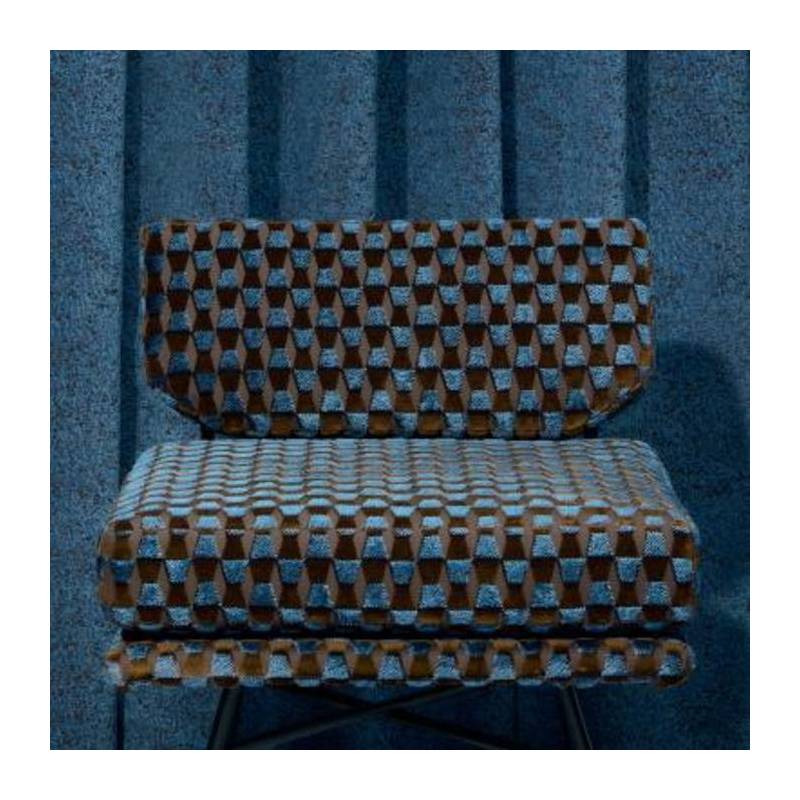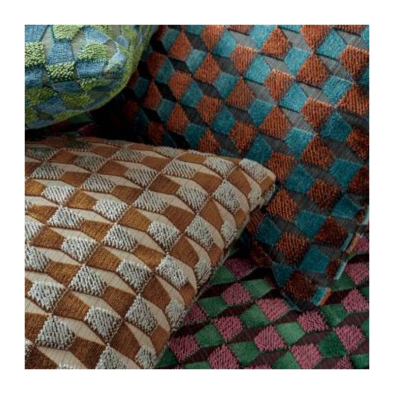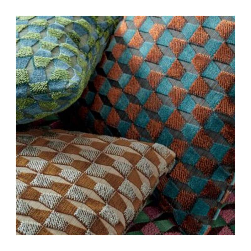 Précieux velours jacquard. Sur un fond de coton, une composition dynamique de trapèzes de poil rasé qui alternent avec des trapèzes aux touffes de poil plus haut. Le résultat est un effet changeant et vibrant qui rappelle les œuvres de l’artiste futuriste Fortunato Depero. Le poil, de deux hauteurs différentes et réalisé avec deux types de viscose (une plus opaque et une plus brillante), crée une tridimensionnalité marquée qui se développe sur trois niveaux: le fond, le poil coupé et les “cils” du poil haut (en viscose brillante). Fortunato présente un dynamisme marqué également au niveau chromatique. Adapté pour un emploi fréquent.