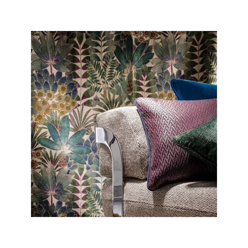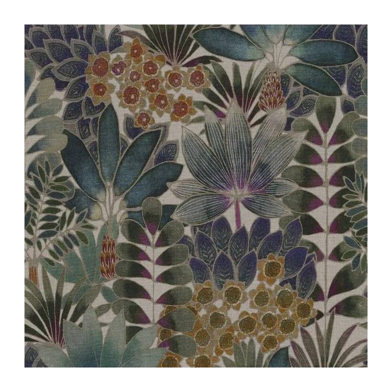 Cette toile de lin dépeint un jardin luxuriant, une jungle exubérante dans l’esprit du peintre français Henri Rousseau, dit le Douanier. Sur ce tissage 100% lin, l’impression numérique appose une effloraison de couleurs vives, chatoyantes.