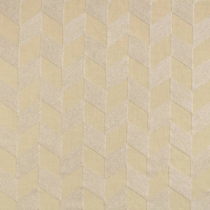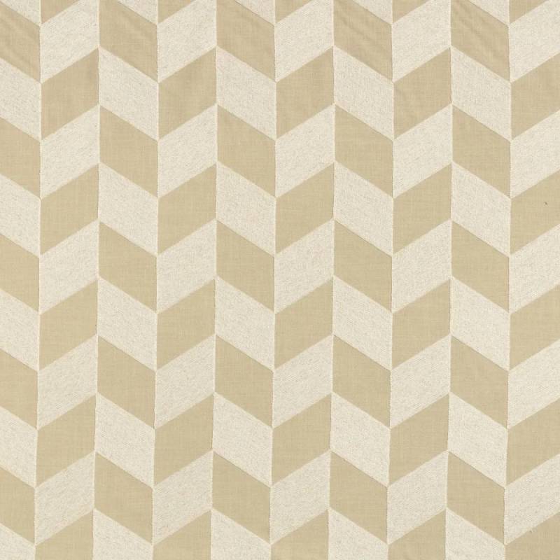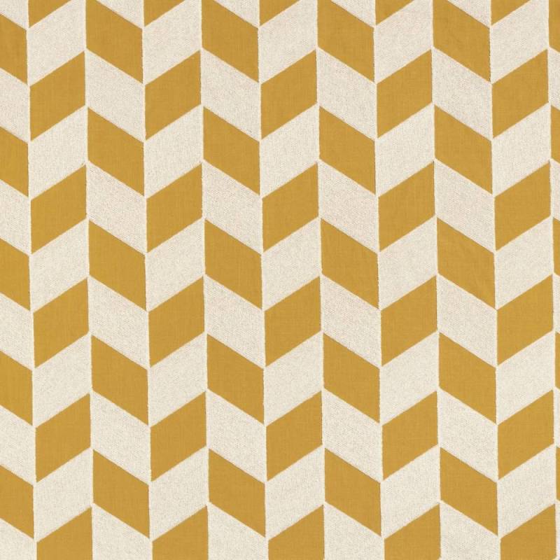 La recherche d’épure se manifeste par un maxi dessin géométrique de parallélépipèdes disposés en chevrons : une idée simple bousculée par l’originalité de la technique brodée, qui appose un léger relief par rapport au fond toile. De l’échelle nait la puissance, du mélange de matière comportant du coton et du lin, allié à la tactilité brodée, nait l’expressivité.