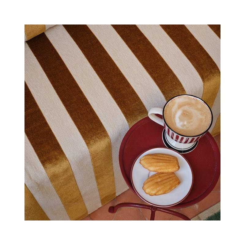 D'une esthétique graphique saisissante, une rayure intemporelle est réinterprétée grâce à un jeu subtil de boucles de lin et de velours de viscose. Le contraste des textures crée un dialogue captivant entre un éclat discret et une douceur mate sobre, jouant avec la lumière pour un effet exquis.