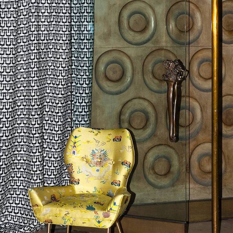 Des dragons amusants animent ce luxueux Jacquard teint fils inspiré des kimonos. La Japon se débarrasse de tout trait de sévérité, pour nous transporter dans un monde ludique, dans lequel un personnage curieux, au corps de serpent et à l'âme d'Arlequin, joue une scène ponctuée de franges colorées. L'utilisation des couleurs, le motif et les détails révèlent une approche inhabituelle et traduisent sur tissu l'interprétation du monde des dragons.