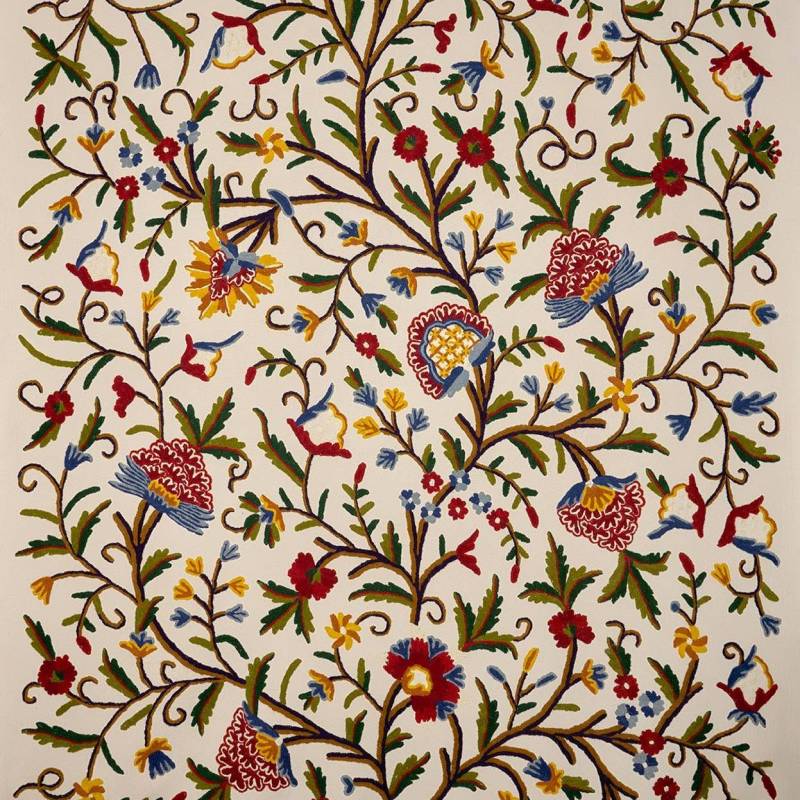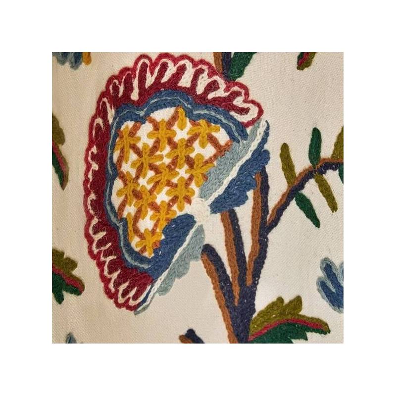 Ode à la nature, SERAMPORE présente un magnifique arbre de vie aux tonalités joyeuses et printanières brodé main sur coton au caractère précieux et rare.