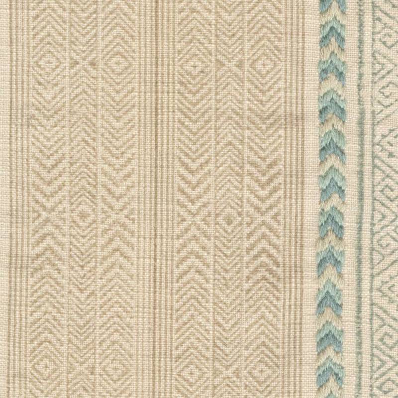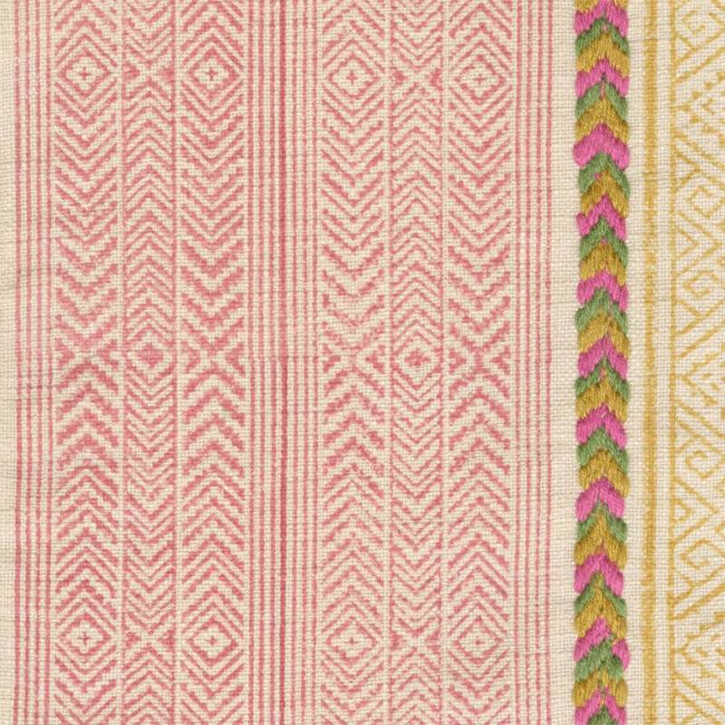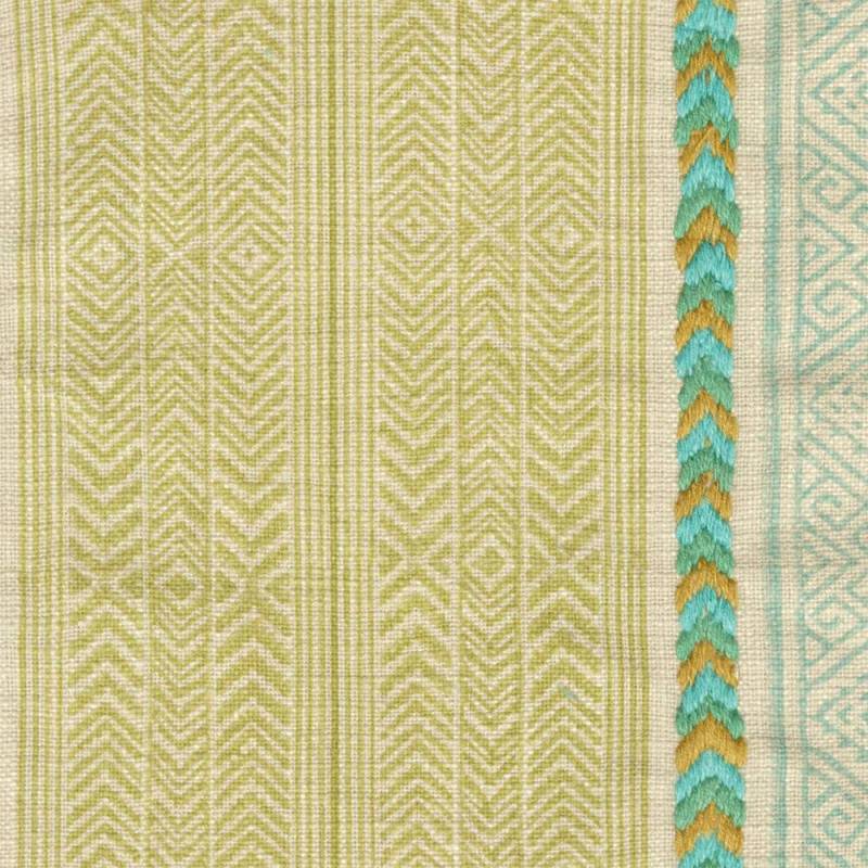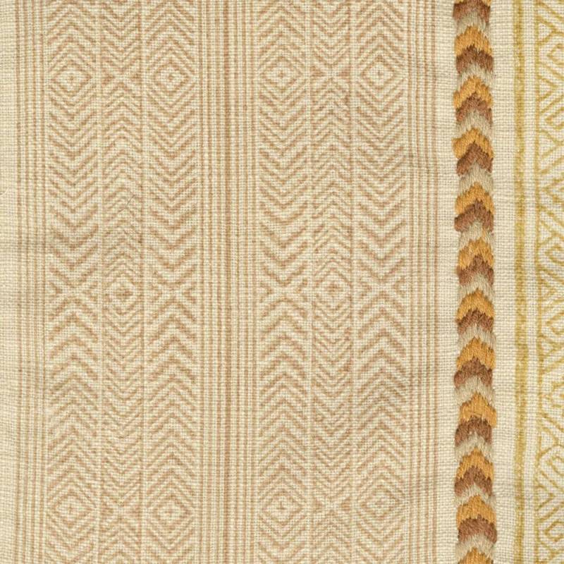 Large rayure ethnique imprimée à la planche de bois, ce dessin s'enrichit d'une broderie sur fond coton, avec la beauté du fait main.