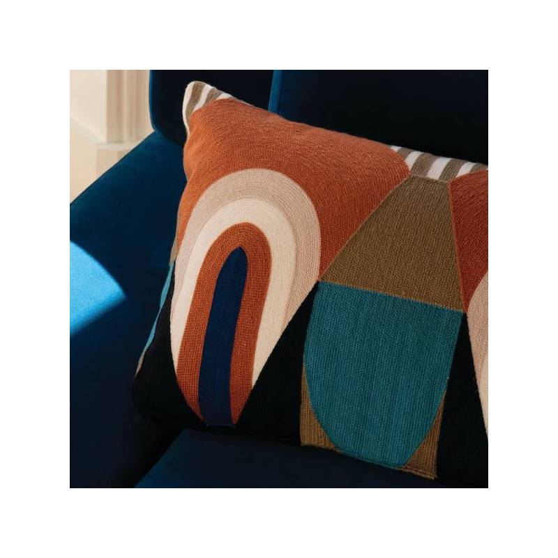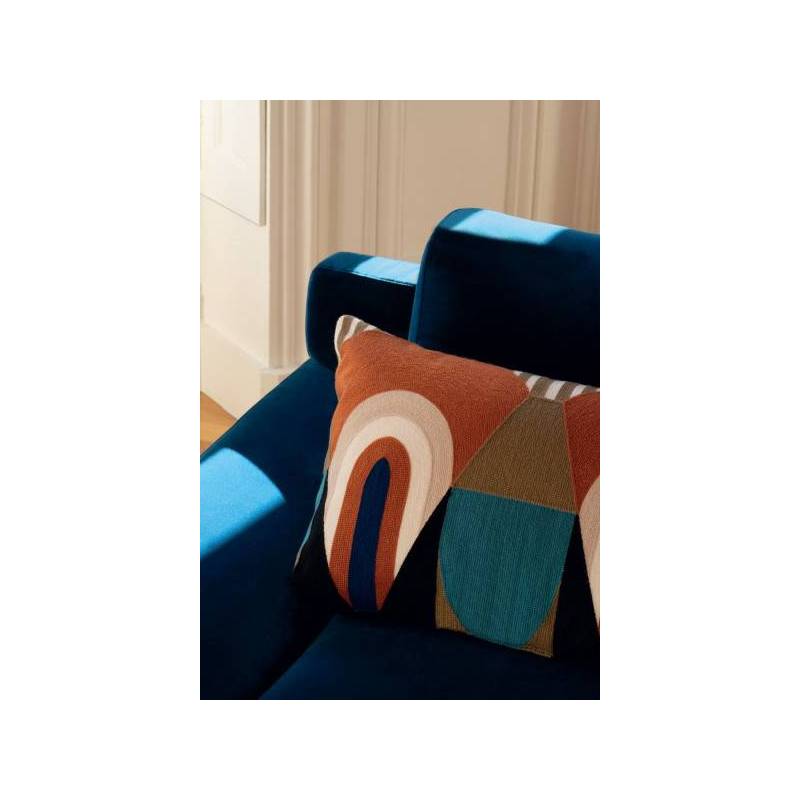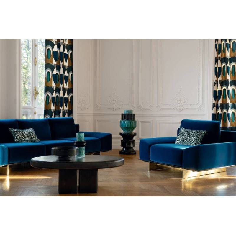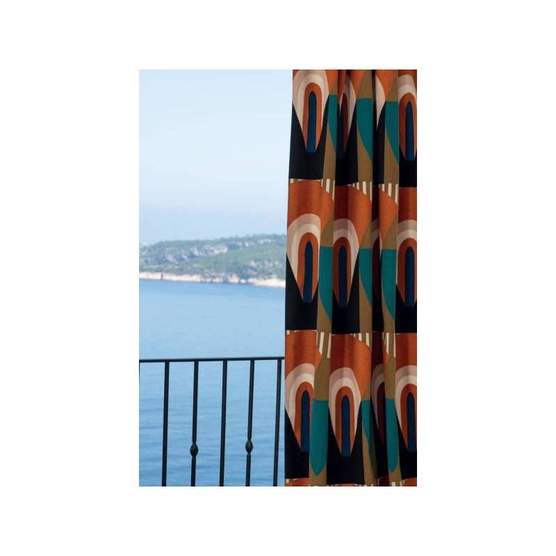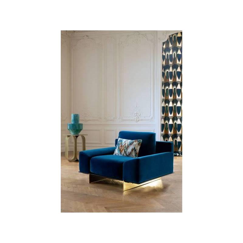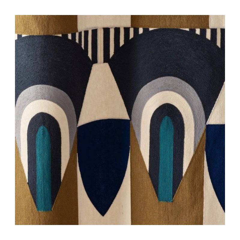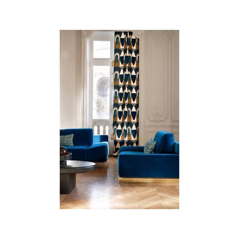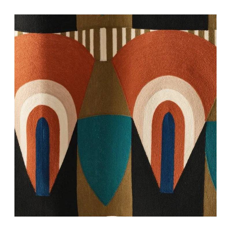 À la frontière des Arts Déco libres et modernistes des années 1930 et ceux, joyeux et chamarrés, des artistes créoles naît l’étoffe brodée « Talisman Sacré », édité en deux coloris exclusifs. Sur le coloris « Terre d’Ombre », la géométrie s’épanouit du rouge capucine au bleu Seychelles. Sur le coloris « Bleu Misia », la couleur signature de la marque interagit avec d’autres bleus, givre et nuit. Les formes audacieuses chevauchent de plus fines rayures, et toutes susurrent les mêmes principes de symétrie et d’harmonie colorielle. En vertu du traitement de finition dont il a bénéficié, cette broderie promet des drapés au superbe tomber, dans un style graphique et contemporain.