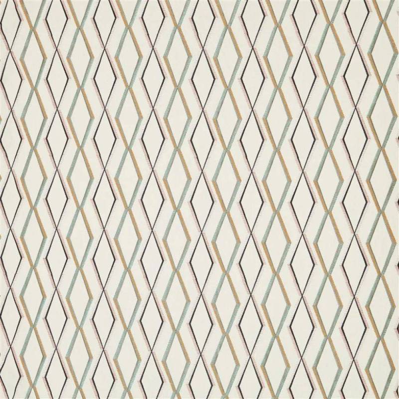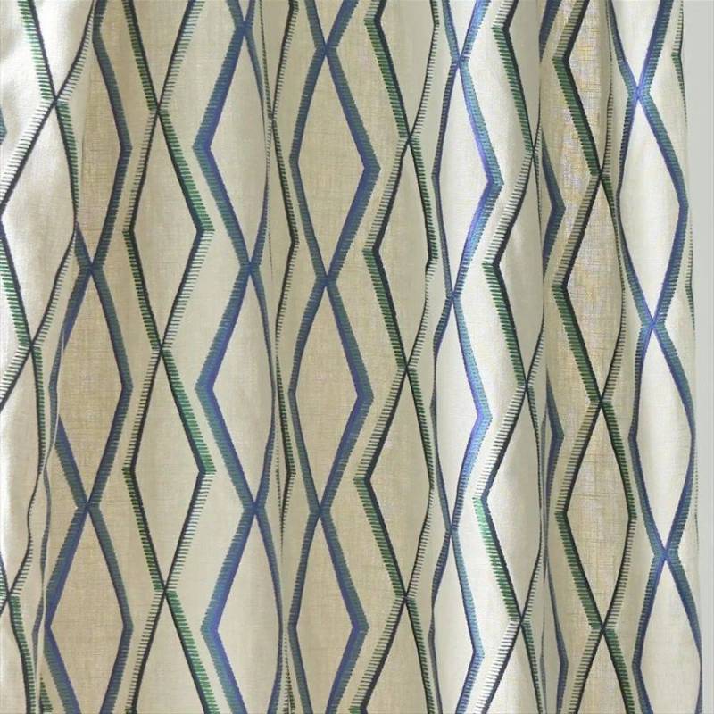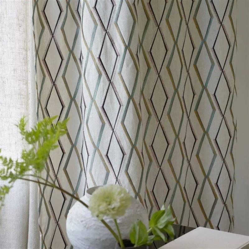 Ce tissu d'intérieur élégant présente un motif en treillis de diamants de taille moyenne, brodé de fils multicolores sur un fond en pur lin texturé. Cette broderie contemporaine est disponible en trois coloris élégants. Convient pour les rideaux, les coussins et les stores.